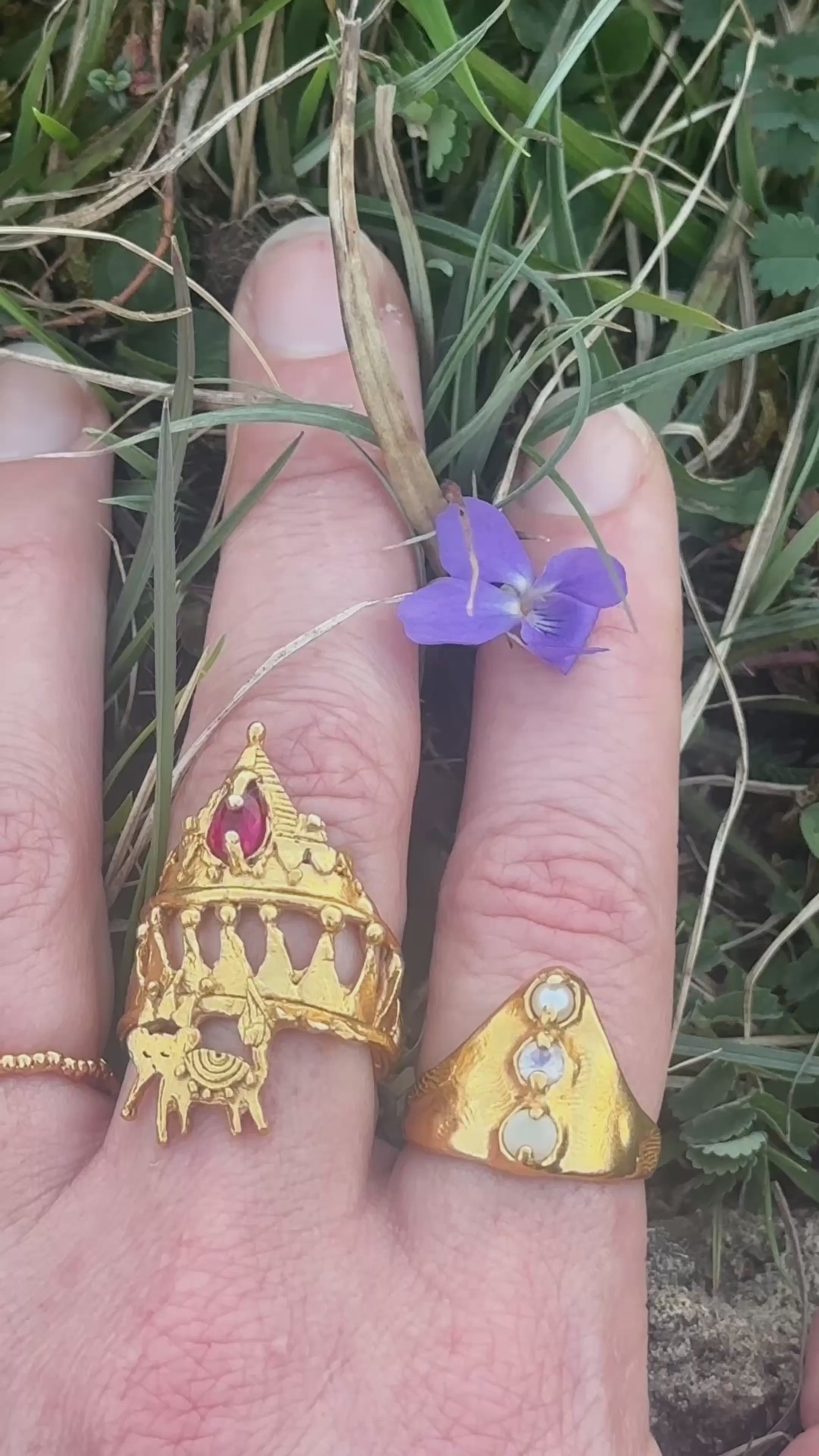 Materials: 24k gold plated brass with a AAA moonstone, Opal & Pearl. We plate all of our rings with 4 microns of gold and use the best of the best for all of our gold plating. This thickness is way above industry standard and means they wear marvellously well.